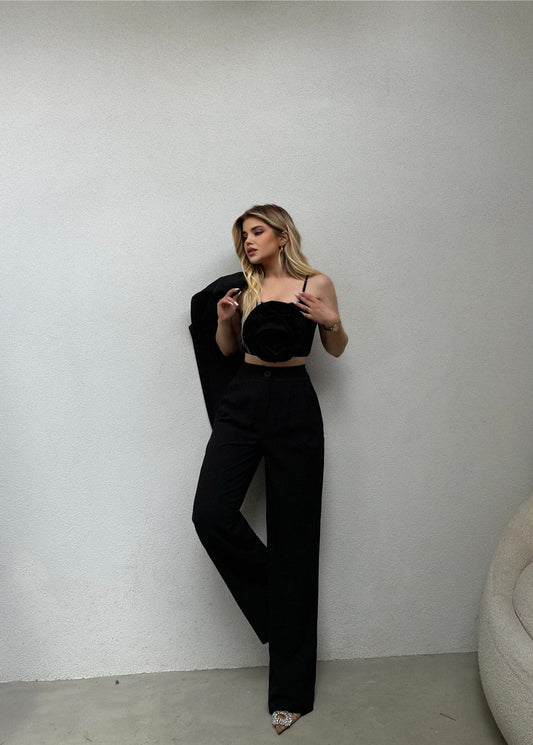 Set me tre pjese.Vjen me xhakete,crop me lule dhe pantallona stil i gjere.Material i plote...