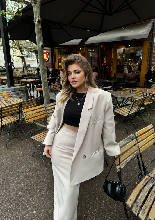 Kostum xhakete oversize dhe fund. Fundi eshte i gjate me nje te care mbrapa. Teper...