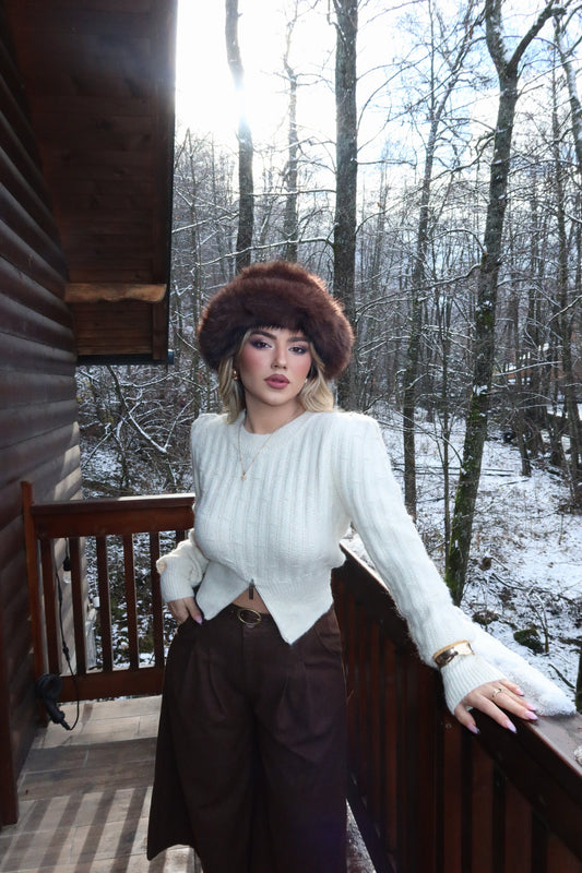Pulover kafe, e zbukuruar me fjongo te vogla bezhë. Material i bute dhe i ngrohtë,...