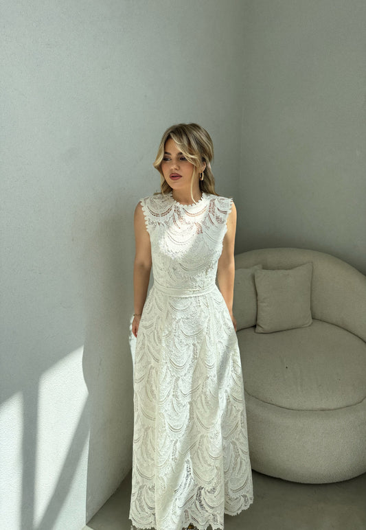 Fustan i gjate me dantelle. Eshte me zinxhir ne pjesen pas. Ka detaje te vecanta...