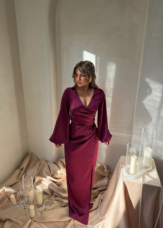 Fustan saten ne ngjyren lejla. Fustani eshte me krahe te gjata, material i reahtshem. Ideal...