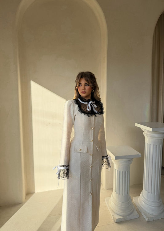 Fustan bezhë me dantellë të zezë në pjesën e qafës dhe te kyçet. Elegant, delikat...