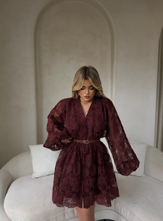 Fustan me prerje asimetrike ngjyre kafe, me detaje dantelle ne dekolte dhe ne fund te...