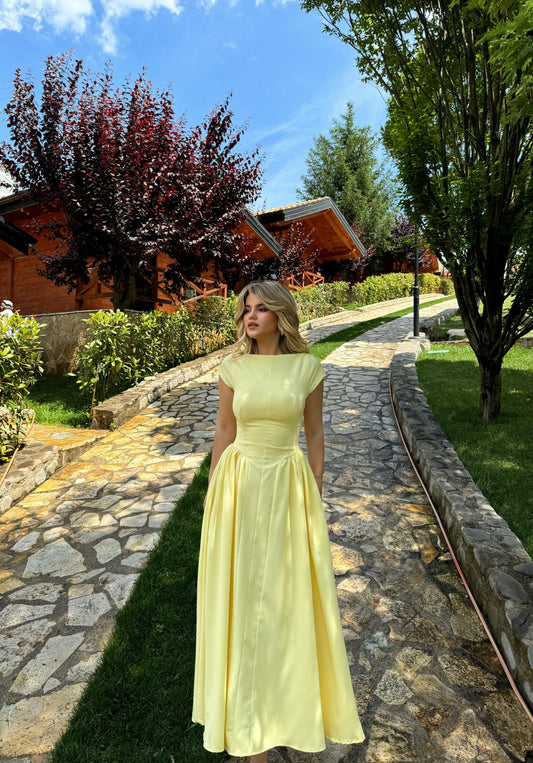 Fustan i gjate ne ngjyren e verdhe. Eshte i hapur ne kurri dhe rri super...