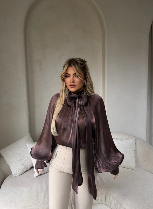 Këmishë e zezë me shkëlqim të lehtë, me lidhje pas në qafë. Elegante, femërore dhe...