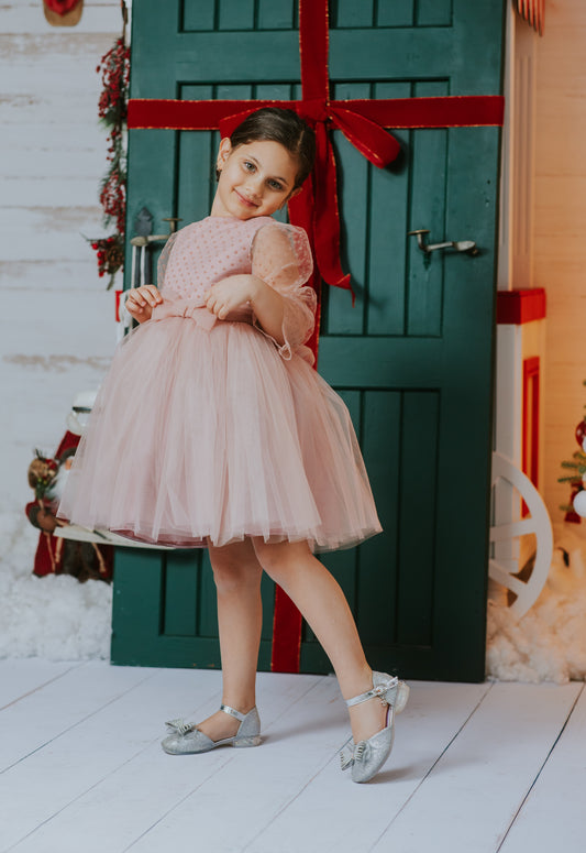 Fustan tyl me pika ne pjesen e siperme dhe tek krahet. Ka fjongo/rrip ne bel...