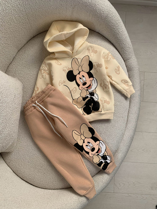 Kostum sportiv me dy pjese. Vjen me hoodie dhe tuta me detaje me Minnie Mouse....