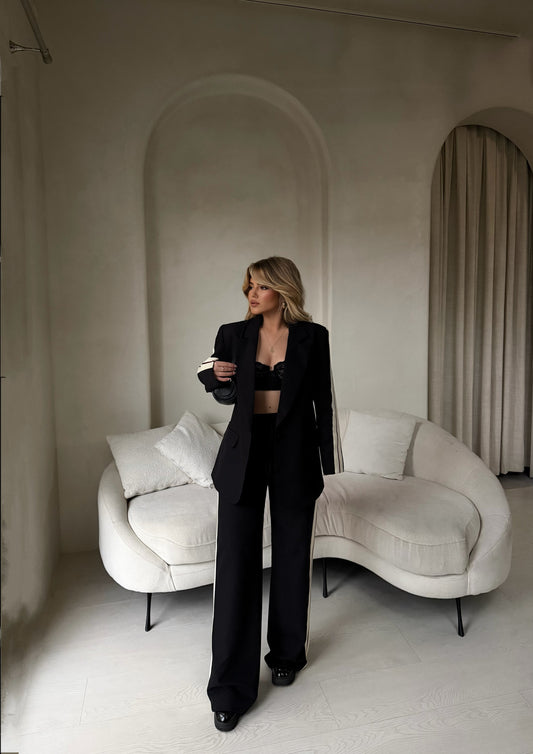 Set me dy pjese ne ngjyren e zeze. Seti perbehet nga xhaketa me kopsa perparadhe...
