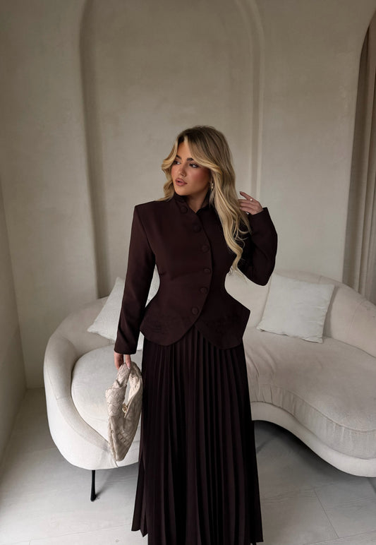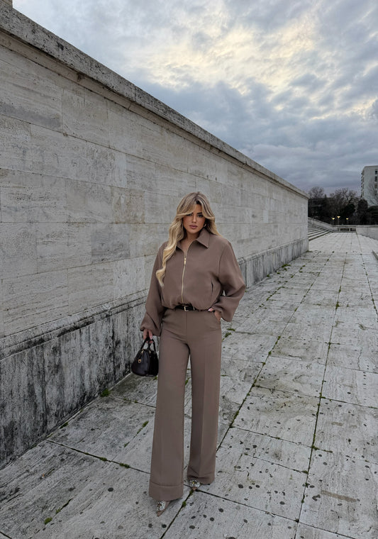 Set me dy pjese ne ngjyren Camel. Seti perbehet nga xhaketa me zinxhire dhe pantallonat...