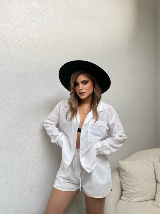 Set me kemishe dhe pantallona te shkurter. Kemisha eshte me menge te shkurter dhe jake...