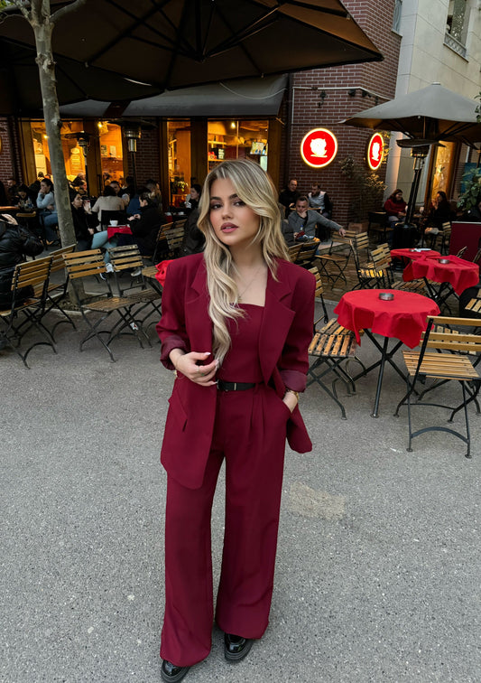 Set klasik ne ngjyren kafe. Seti perbehet nga tre pjese crop,xhaketa oversize dhe pantallonat prerje...