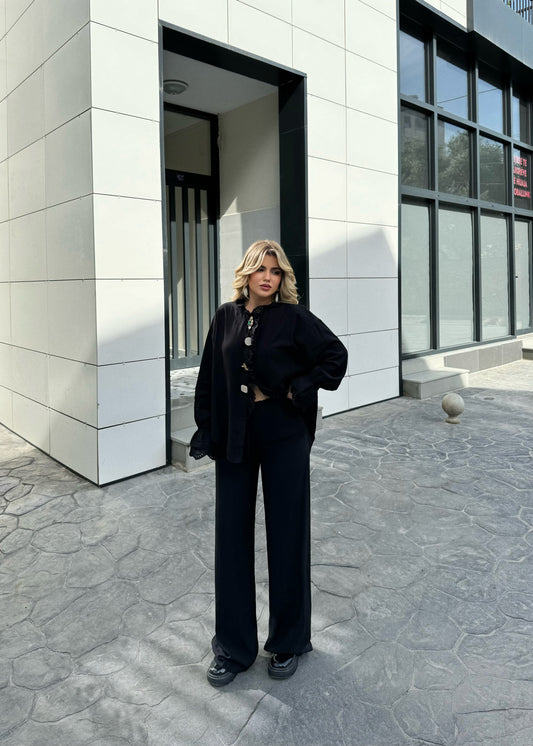 Set kemishe dhe pantallona te gjata me lidhese tek beli. Kemisha eshte me dantelle tek...