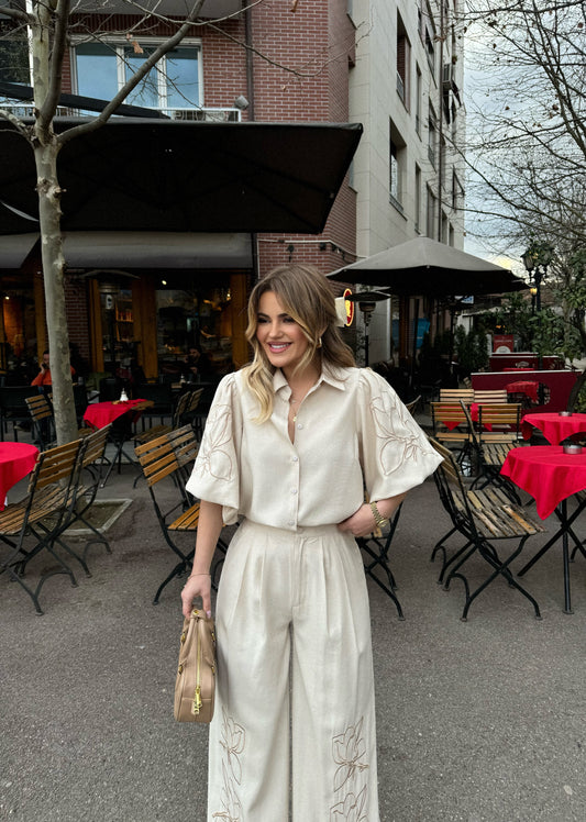 Set me kemishe dhe pantallona. Kemisha ka dantelle me lidhje te pjesa e jakes.Pantallonat jane...