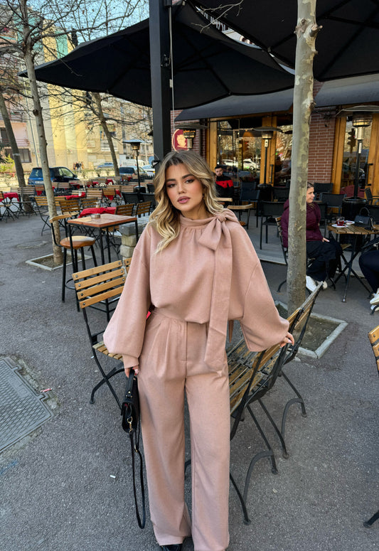 Kostum elegant në ngjyrë kafe të errët, përbërë nga xhaketë oversize dhe pantallona të gjera...