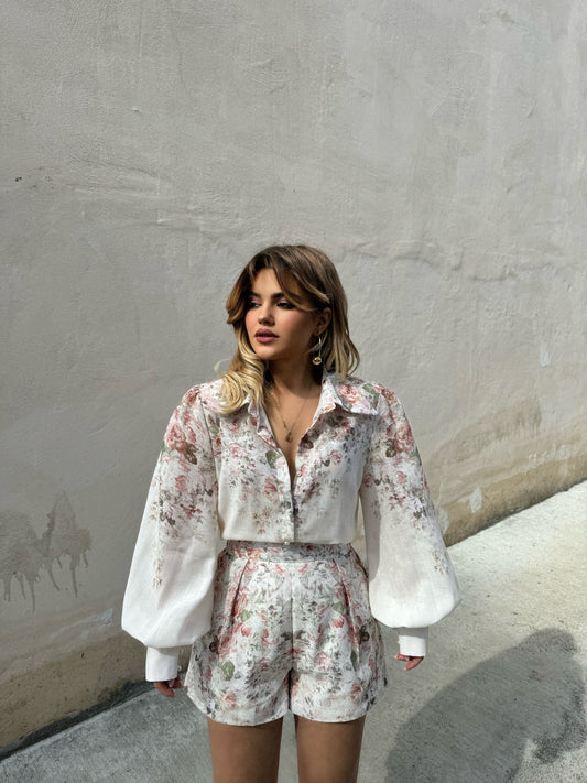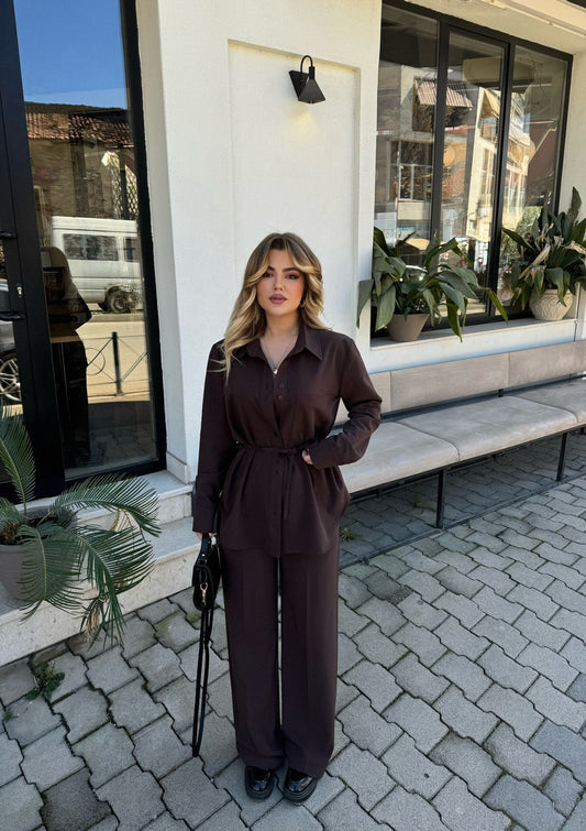 Set lino kemishe dhe pantallona te gjera. Kemishe e mbyllur me kopsa deri ne fund...