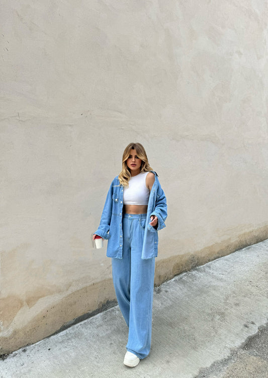 Set xhins, kemishe dha pantallona me llastik ne bel, pantallonat vijne te gjera.