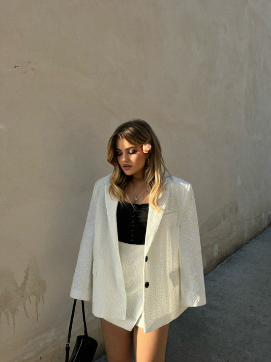 Set i bardhe i perbere nga bluza e shkurter me qendisje ne pjesen e jakes...