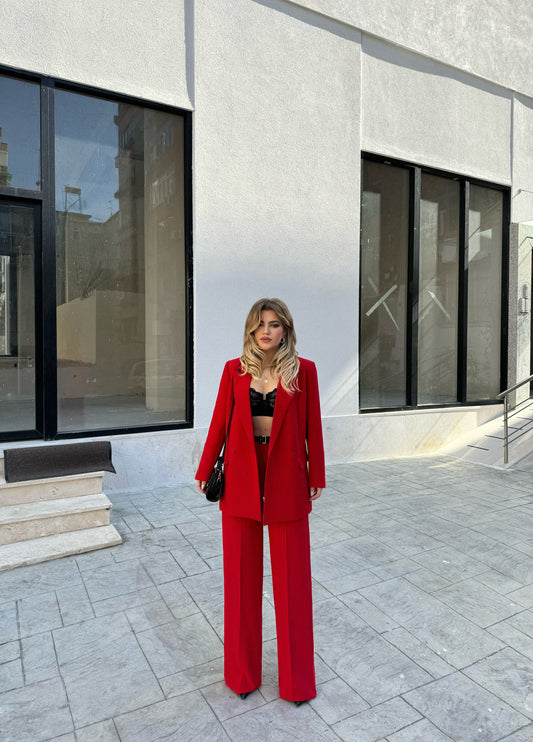 Kostum klasik i kuq. Eshte me xhakete te drejte , ka xhepa ne pjesen anesore...