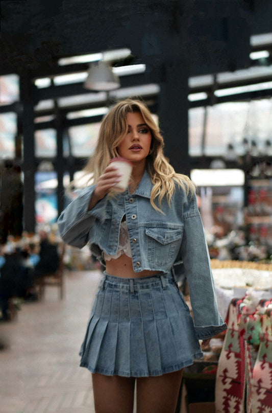 Set bluze dhe fund i shkurter. Bluza mbyllet me kopsa ne ngjyren gold perpara. Material...