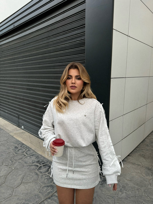 Set bluze dhe fund i shkurter me llastik ne bel. Ka detaje dantellash dhe fjongo...