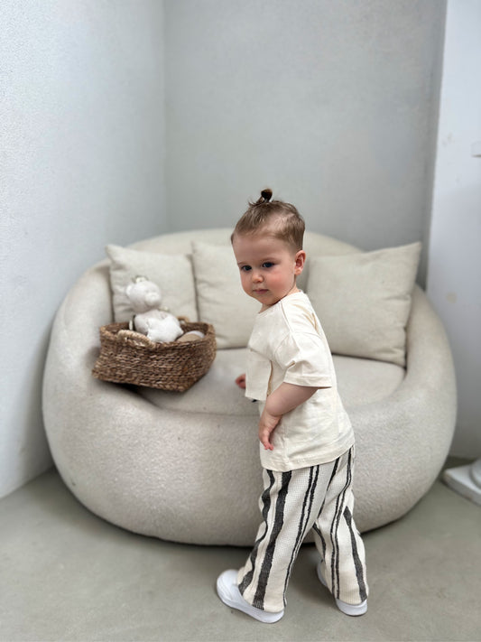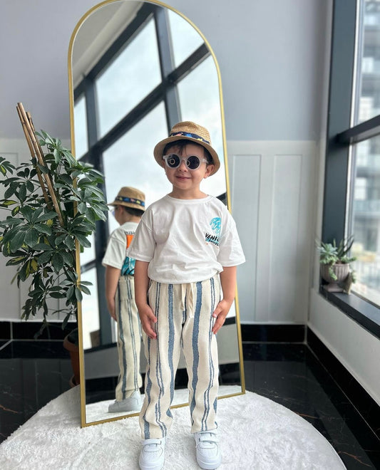 Seti bluze dhe pantallona. Bluza vjen me menge te shkurtera dhe dizenjo ne pjesen para....