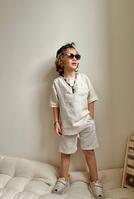 Set bluze dhe pantallona te shkurter. Bluza vjen me nje xhep ne pjesen perpara. Ka...