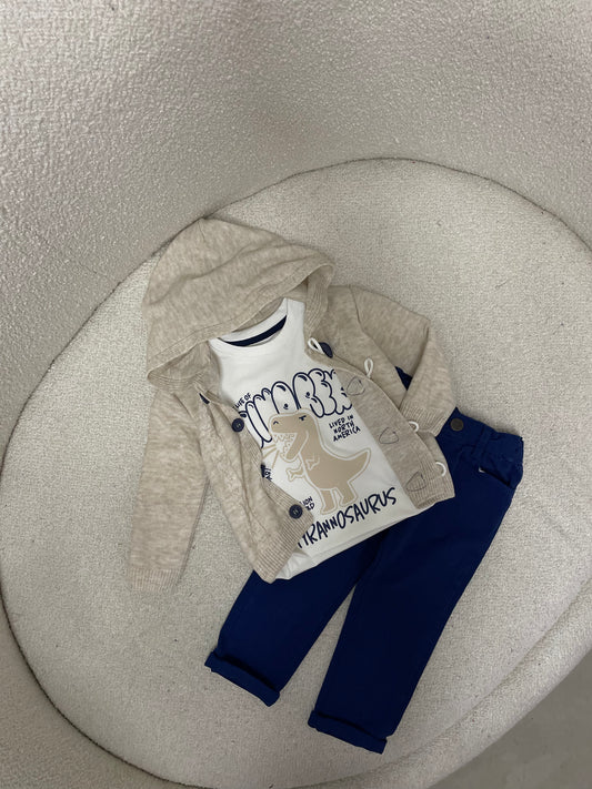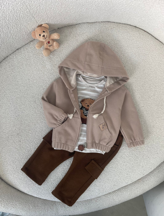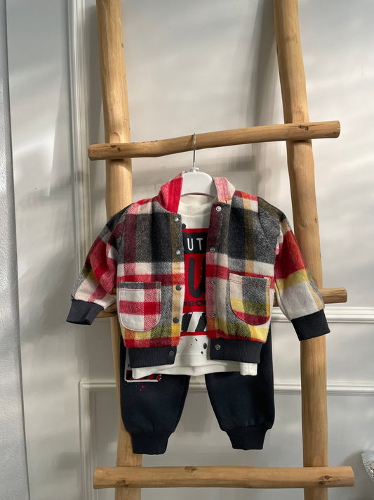 Kostum me tre pjese per djem. Vjen me xhakete me kapuc me kuadrata,bluze me figure...