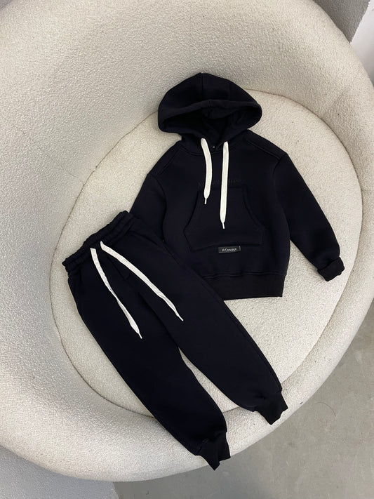 Kostum sportiv me hoodie dhe tuta te gjata. Vjen me xhepa para dhe ka material...