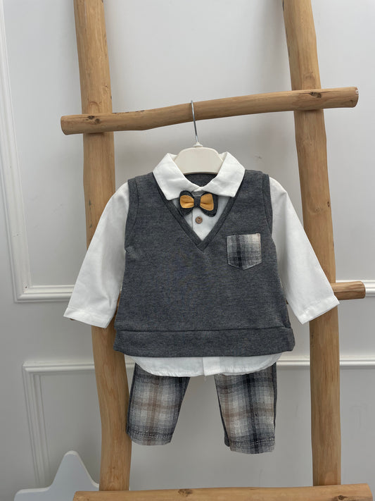 Kostum klasik me tre pjese per djem. Vjen me xhakete, kemishe dhe pantallona te gjata....