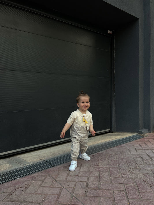 Set bluze me krahe te shkurter dhe pantallona te gjata me viza. Bluza vjen me...