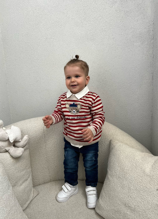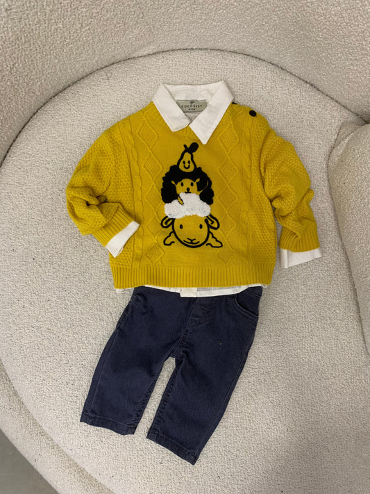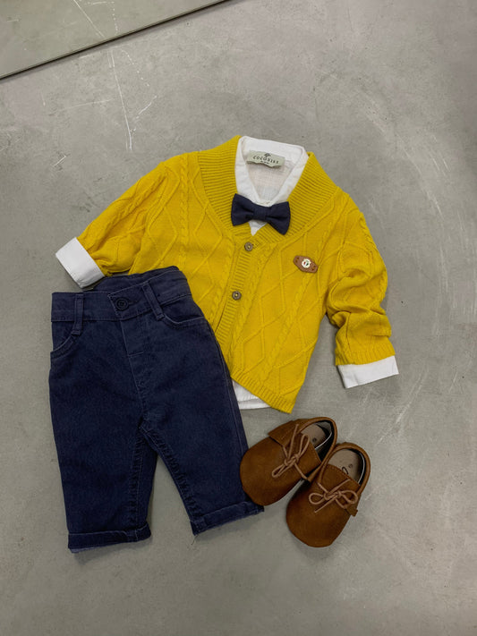 Set me tre pjese. Vjen me pulover me kopsa, kemishe dhe pantallona. Ka material te...