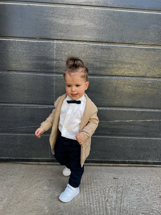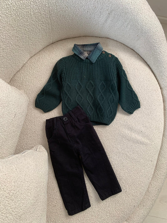 Kostum me tre pjese per djem. Vjen me kemishe me kuadrata,pulover dhe pantallona. Material i...