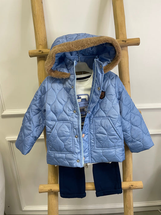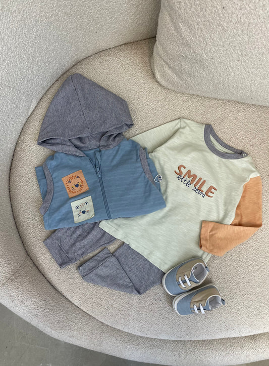 Set me tre pjese:jelek,bluze dhe tuta.Seti vjen ne ngjyre gri dhe bojeqiell.Material pambuku dhe ka cilesi...