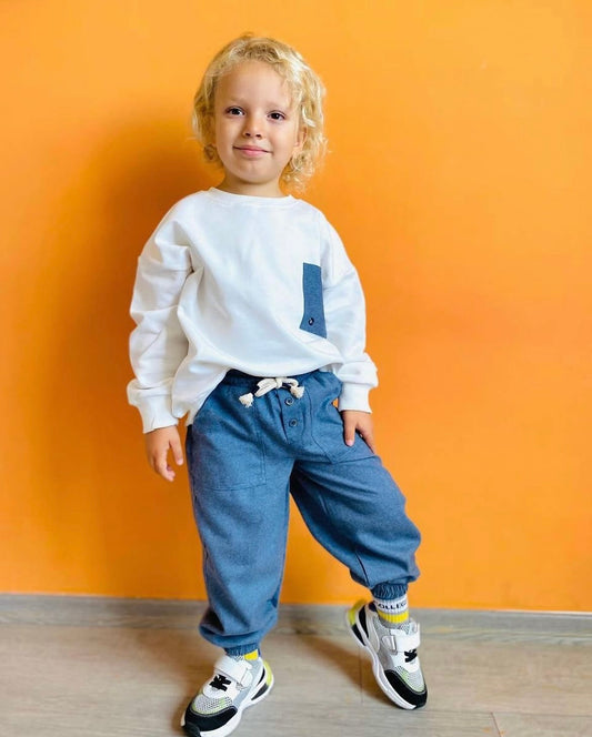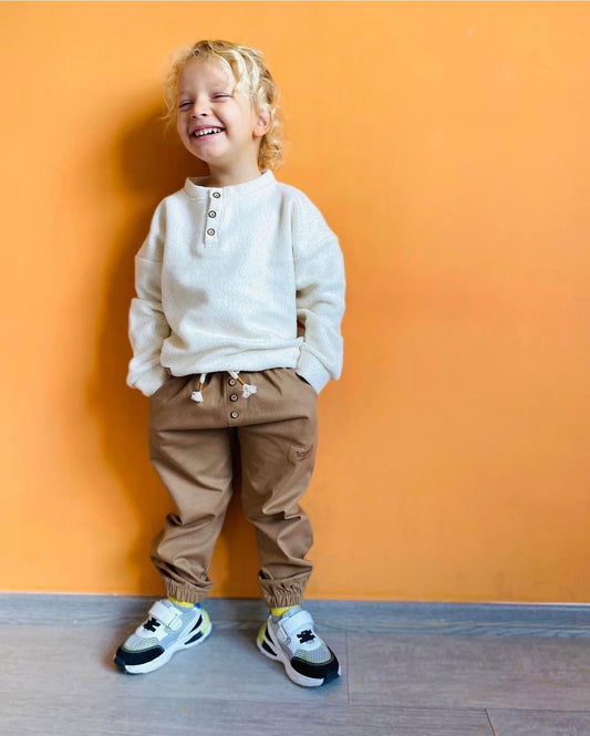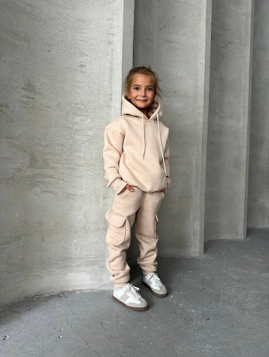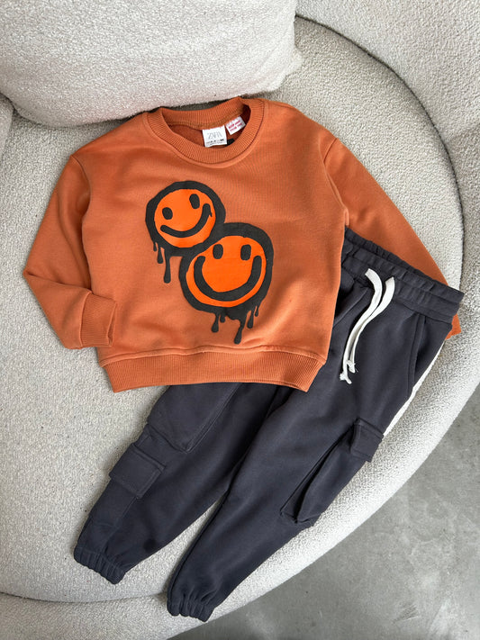 Kostum sportiv me bluze me emoji dhe tuta me xhepa anash. Teper praktik dhe komod.