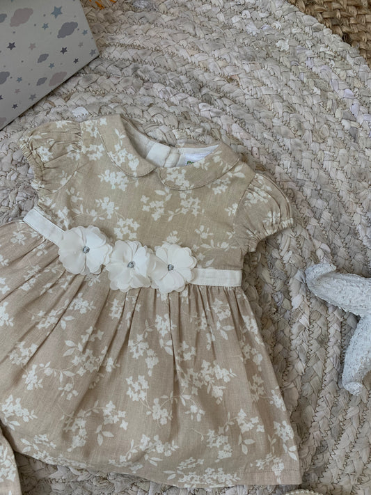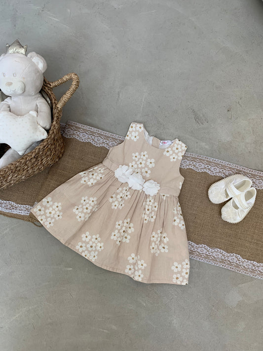 Fustan i shkurter me krahe te shkurter me lule ne bel. Ka material te plote...