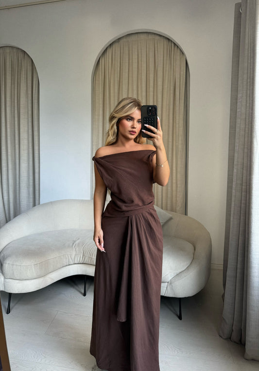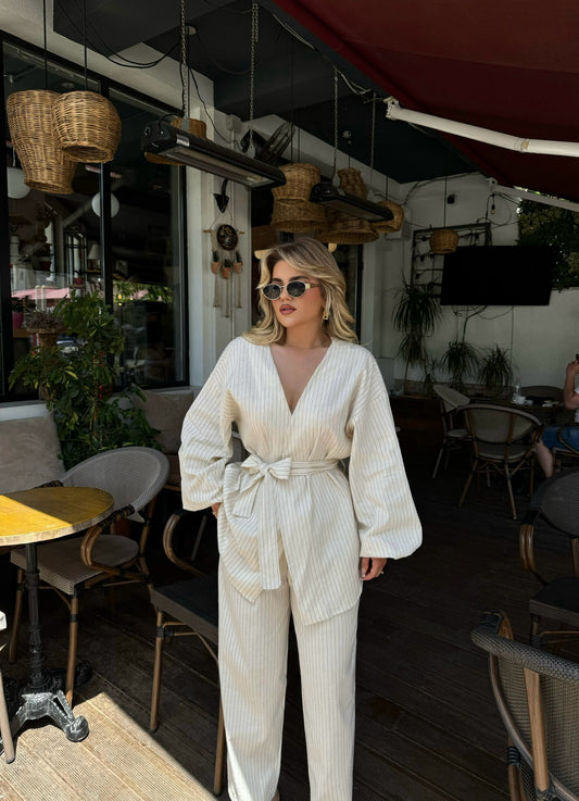Set me kemishe dhe pantallona te gjata. Eshte stil dhe komod. Ka material te plote...