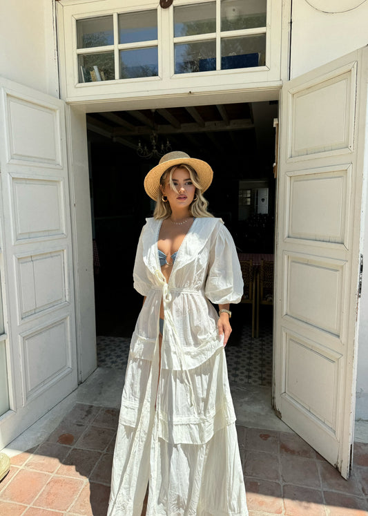 Fustan i gjate me rripa. Eshte ne ngjyren e bardhe dhe i thjeshte. Ka material...