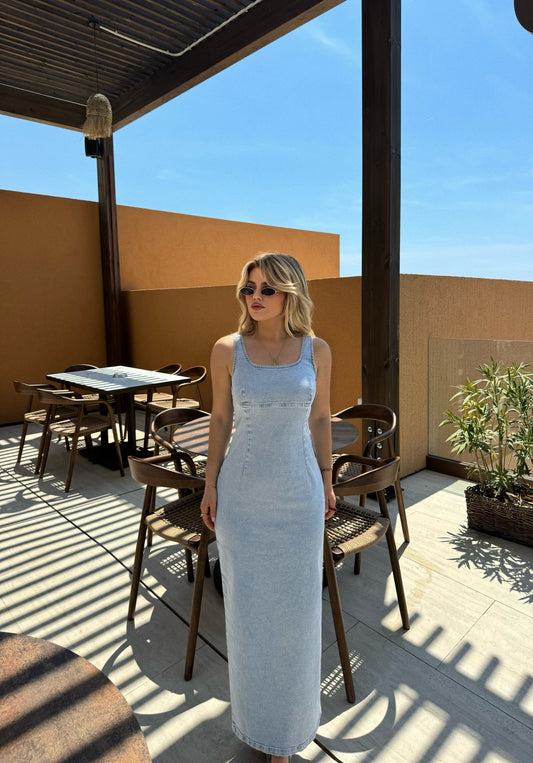 Fustan i gjate xhins pas trupit. Eshte me rripa dhe i thjeshte. Ka material dhe...