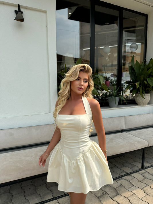 Fustan i shkurter me pala ne pjesen poshte. Eshte ne ngjyren e bardhe dhe bezhe....