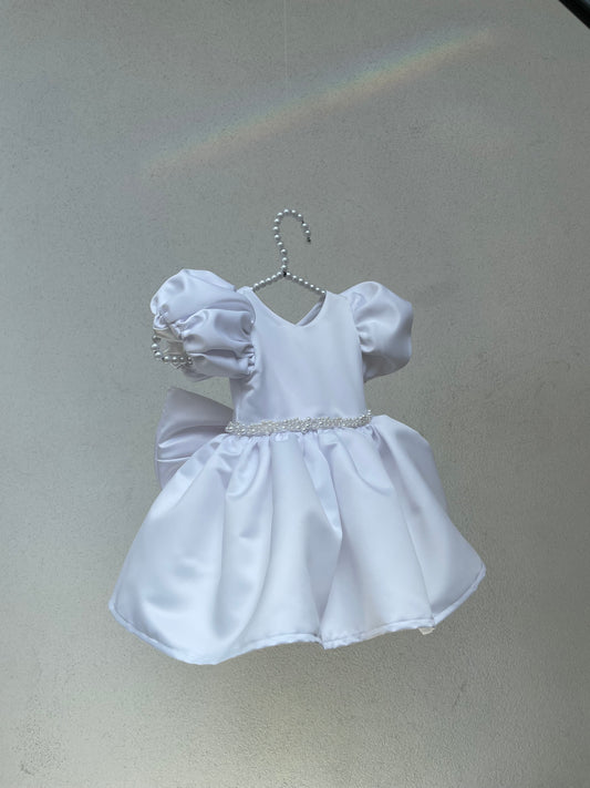 Fustan i bardhe me perla ne bel dhe fjongo ne pjesen mbrapa. Eshte me zinxhir...