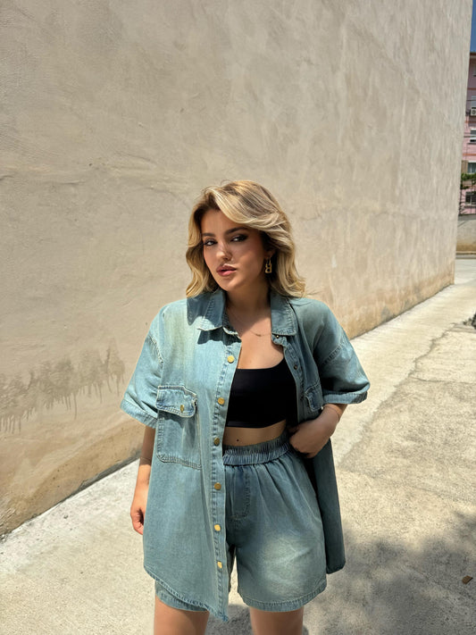 Set bluze me krahe te shkurter dhe xhinse . Bluza vjen me jake ne forme...