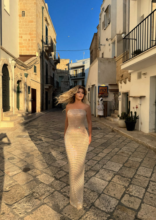 Fustan i gjate bust pas trupit. Eshte me detaje me gure dhe rri yll ne...