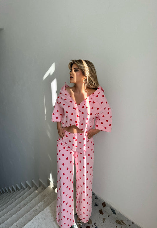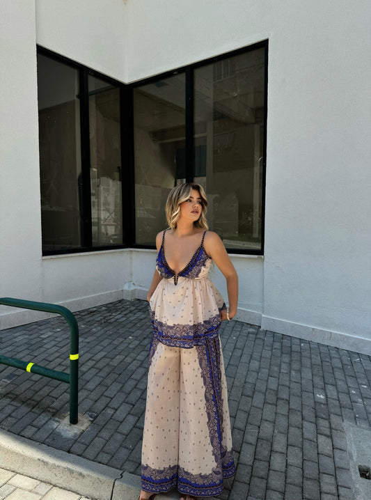 Set me dy pjese. Eshte me kanatiere dhe pantallona te gjate me detaje me lule...