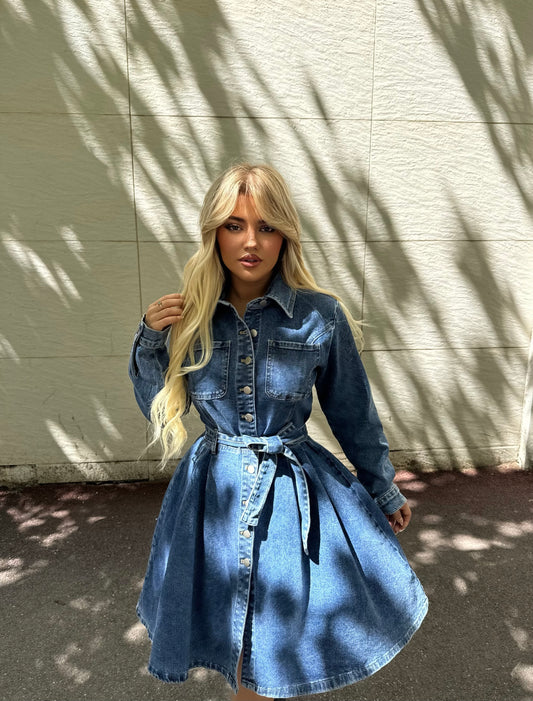 Fustan i shkurter xhins me menge te gjata dhe me rrip ne mes. Me jake...
