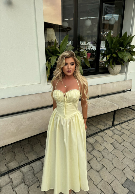 Fustan i gjate ne ngjyren e verdhe. Eshte me rrip ne qafe dhe lidhje tek...
