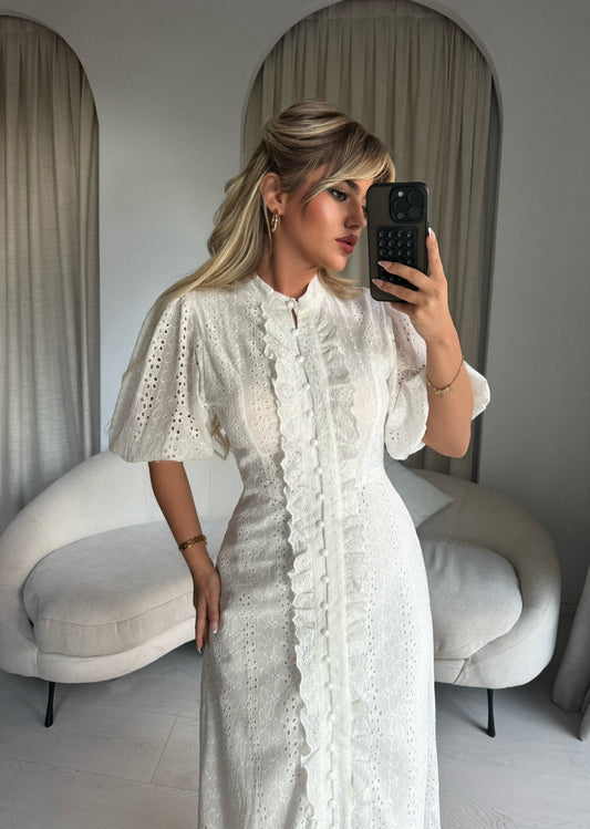 Fustan i bardhe lino. Eshte i gjate pas trupit dhe me detaje yll. Material i...