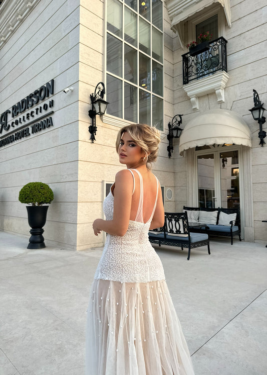 Fustan i gjate me rripa. Eshte me detaje me perla dhe shume stil. Ka material...