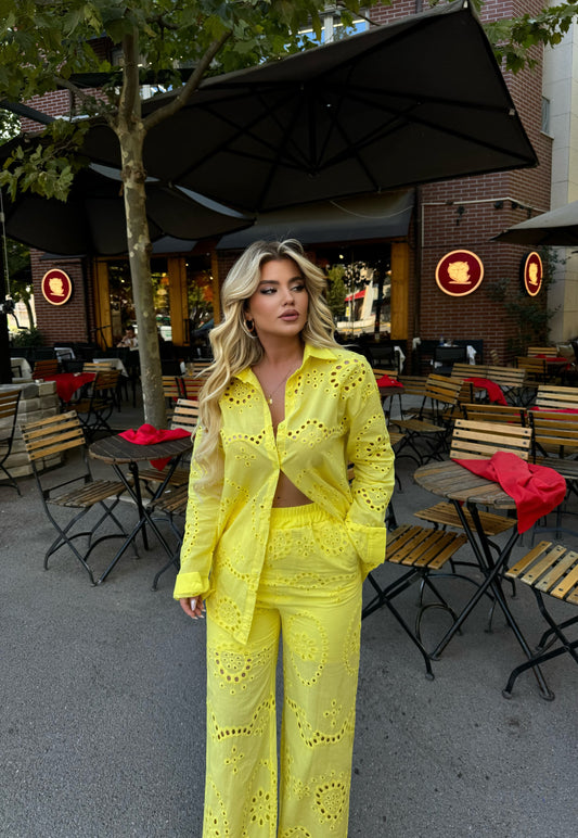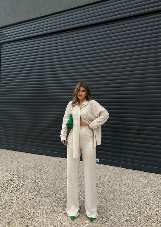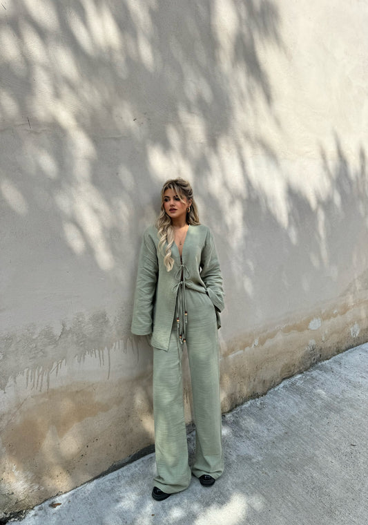Set lino me pantallona te gjera. Bluza eshte me menget e gjera dhe me lidhje...