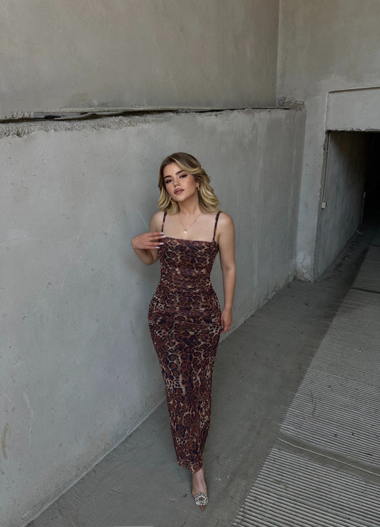 Fustan i gjate me motive leopardi.Vjen me rripa dhe jake ne forme katrore.Material i plote...