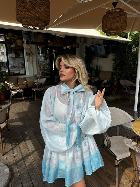 Fustan i shkurter stil oversize. Eshte me detaje per plazh dhe lidhje ne qafe. Ka...